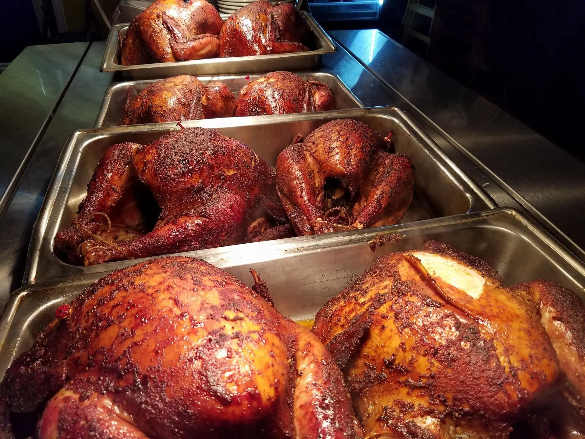 - We take a whole chicken and we cut it from stem to stern. Then we coat it with our homemade chicken rub and smoke it in our cooker. Served with homemade baked beans and cold slaw.
