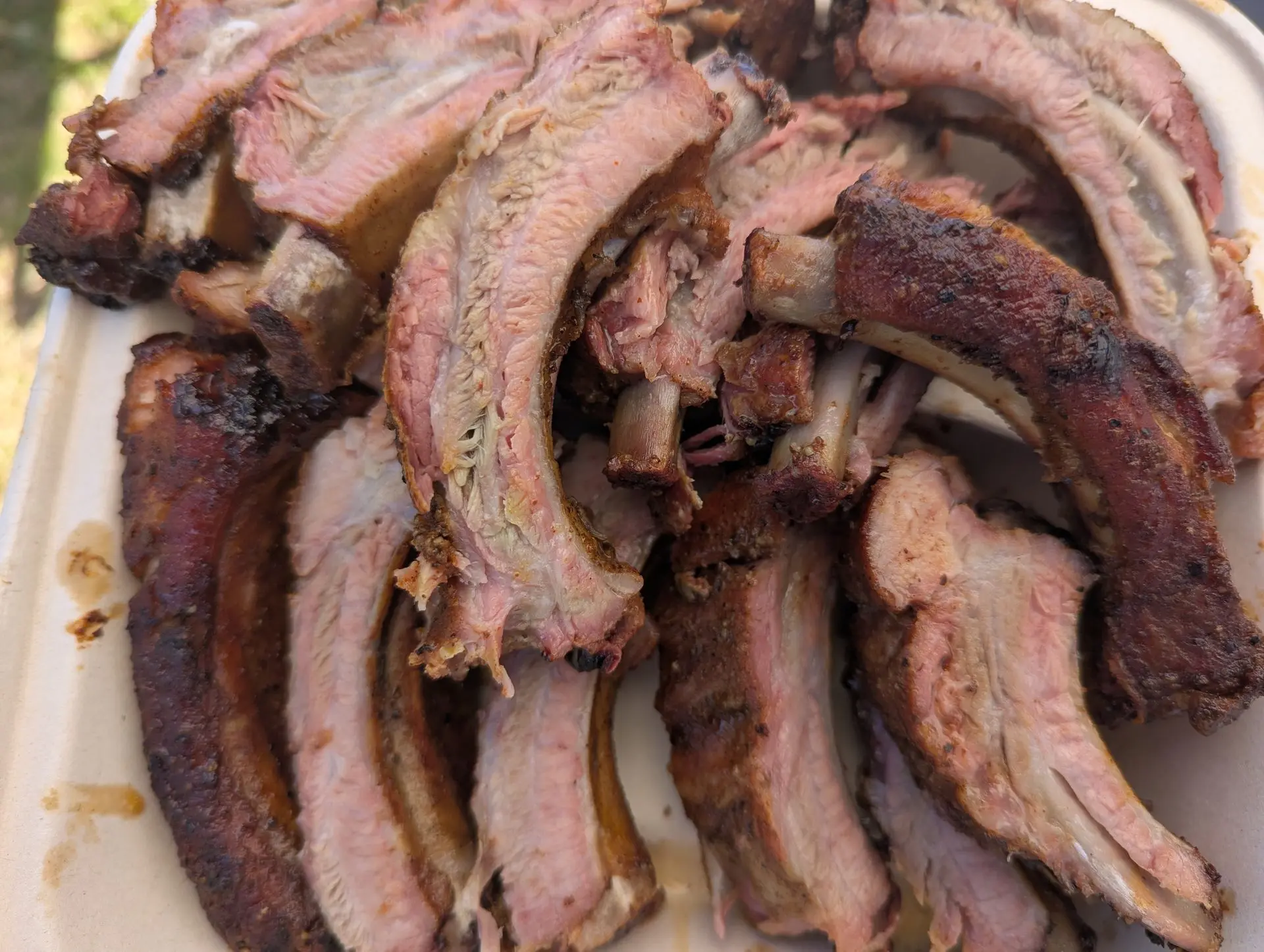 We take a full rack of baby rack ribs and cut it in half. Then we coat it with our homemade rib rub and cook it to perfect tenderness in our smoker. Ummm.